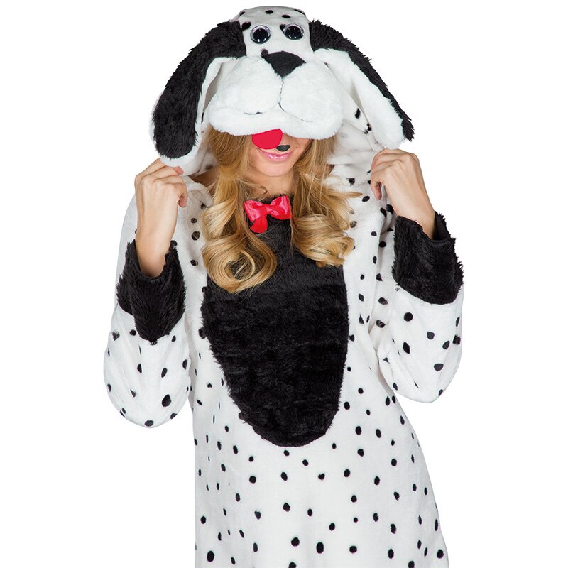 Kapuzenkleid aus Fleece im Dalmatinermuster. Auf der Kapuze ist ein Hundegesicht und lange Schlappohren angenäht. Das Kleid ist an den Ohren, auf der Brust und an den Säumen mit schwarzem Fell besetzt. An der Rückseite ist ein abnehmbarer, ausgestopfter Schwanz befestigt.