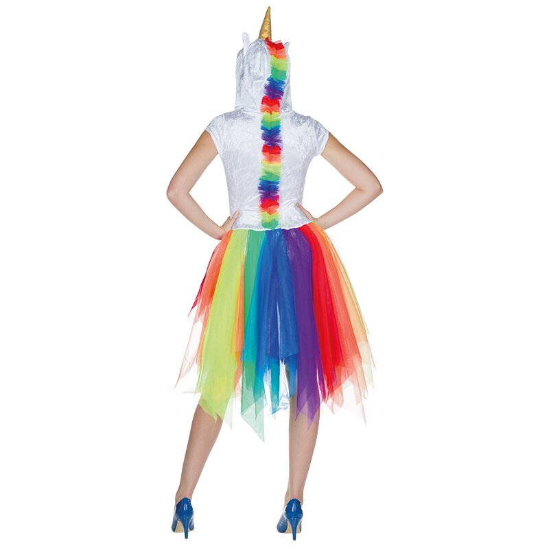 Kurzärmliges Kapuzenkleid aus weißem Pannesamt, auf dessen Vorderseite ein Einhornkopf in Regenbogenfarben gedruckt ist. Der von vorne nach hinten abfallende Rock besteht aus Tüllstücken in den diversen Farben des Regenbogens. An der Kapuze sind Ohren sowie ein goldenes Horn angebracht. Über den Hinterkopf und den Rücken verläuft eine Mähne aus bunten Tüllstücken.