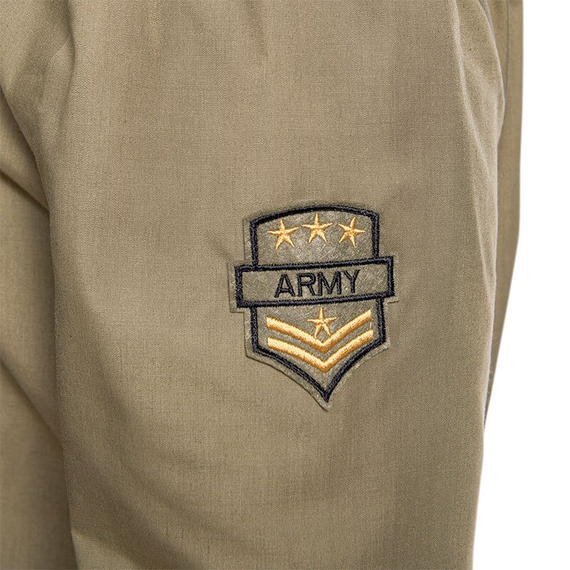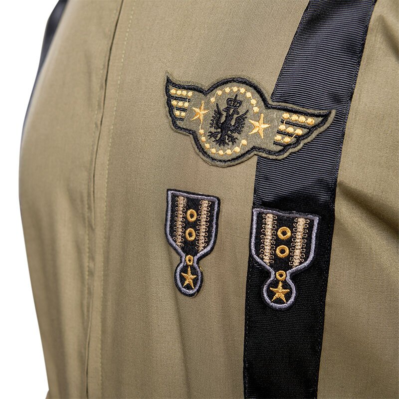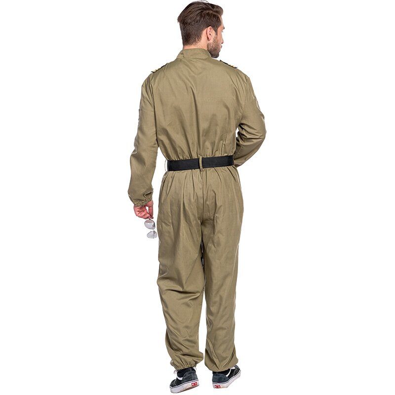 Olivfarbener Overall, der mit diversen Flugabzeichen und Gurten verziert ist. Inklusive eines schwarzen Gürtels mit einer Steckschnalle.