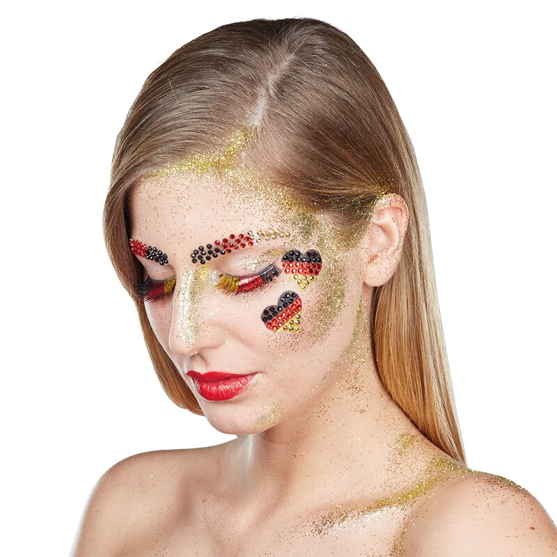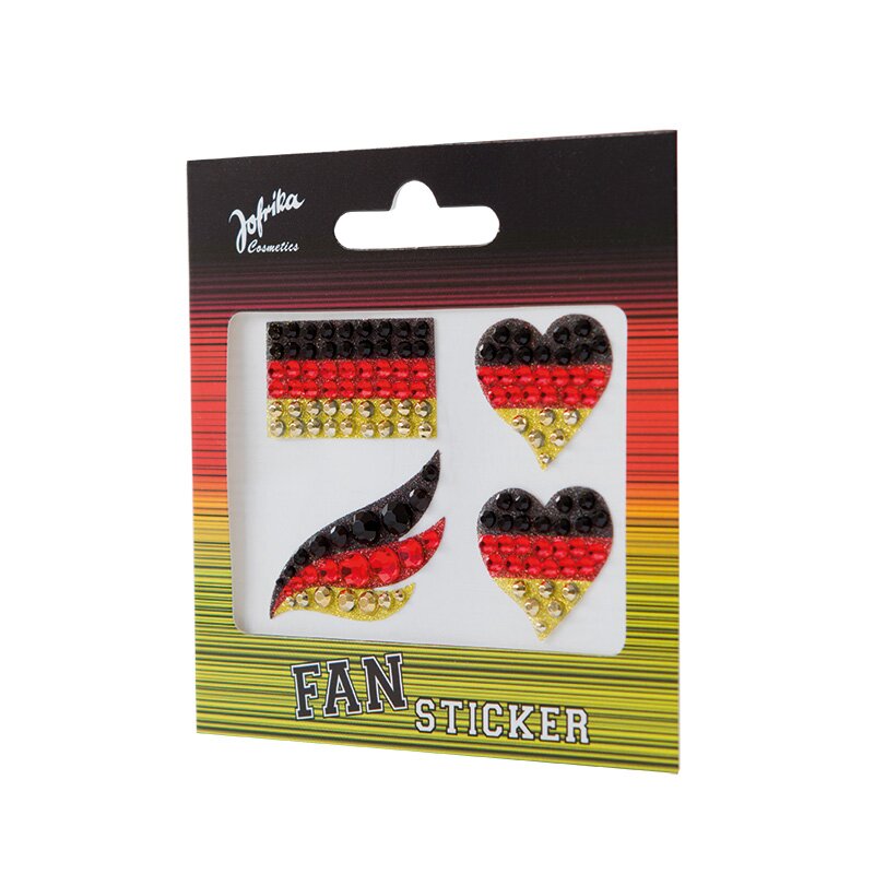 Glitzernde Fan-Sticker in verschiedenen Designs in den deutschen Nationalfarben Schwarz-Rot-Gold.