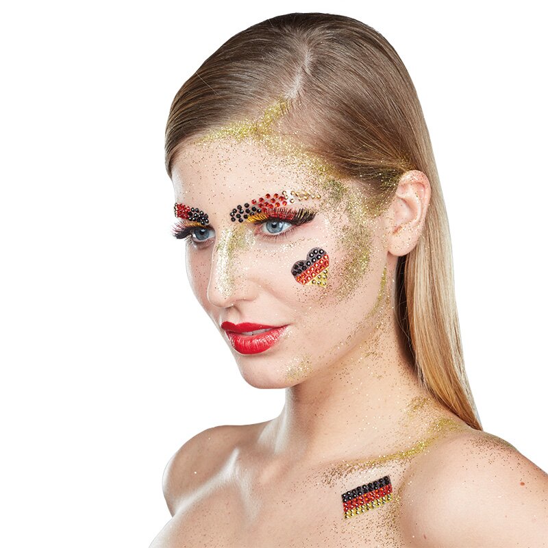 Glänzende künstliche Wimpern in den deutschen Nationalfarben Schwarz, Rot und Gold. Inklusive Wimpernkleber.