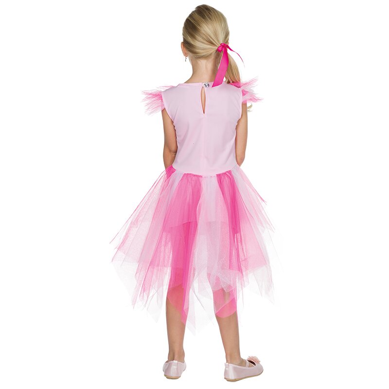 Ärmelloses hellrosa Kleid, auf dessen Brust zwei Flamingos abgebildet sind. Über dem Rock sind weiße und pinke Tüllstücke befestigt.