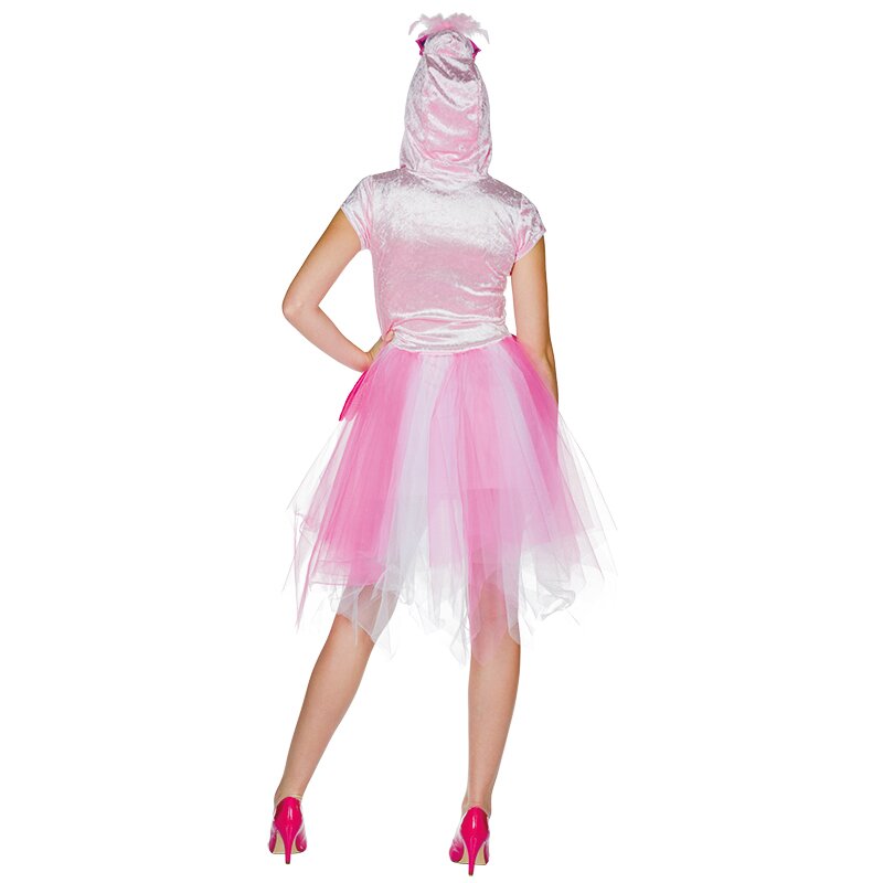 Kurzärmliges Kapuzenkleid mit einem Oberteil aus hellrosanem Pannesamt, das mit einem rosanen Glitzerherz bedruckt ist. Der Rock ist mit von vorne nach hinten abfallende Stoffstücken aus rosanem und weiß-glitzerndeTüll bedeckt. An der Taille sind kleine Flügel angebracht. An der Kapuze ist ein Flamingokopf befestigt, der mit einem Haarwuschel und einer Sonnenbrille dekoriert ist.