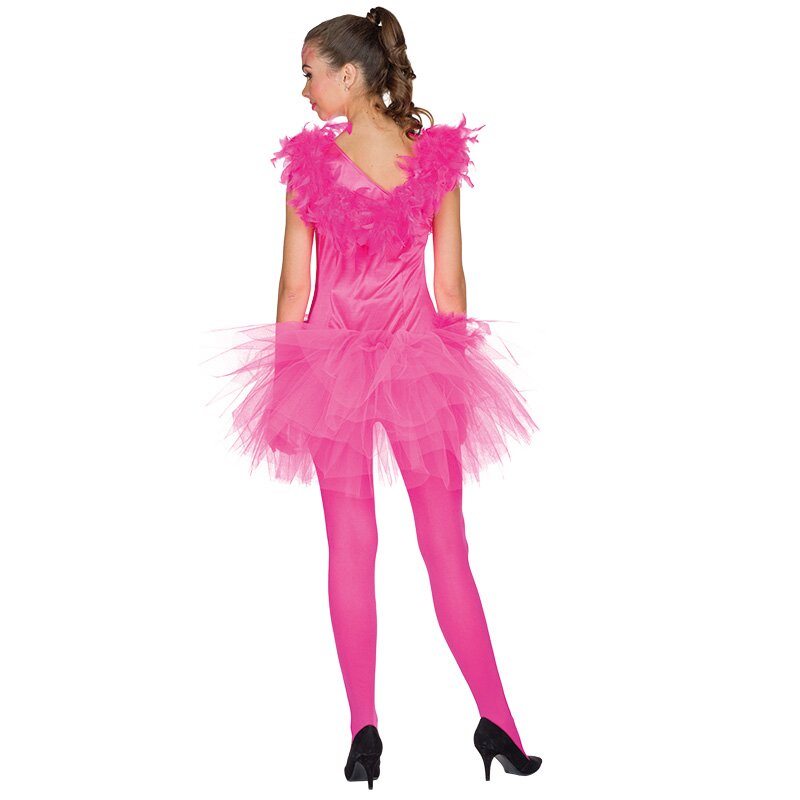 Ärmelloses pinkes Tütükleid, das an den Schultern und Rücken sowie der Taille mit pinken Federn besetzt ist. Der Rock besteht aus mehreren Lagen rosanen Tülls. Ein wattierter Flamingokopf ziert das Kleid.
