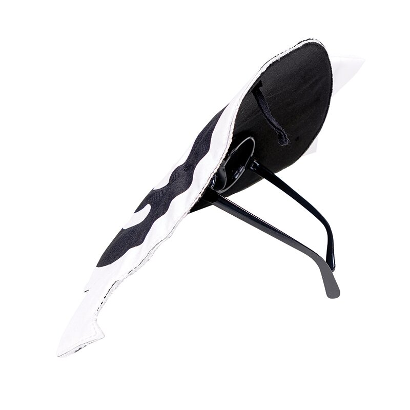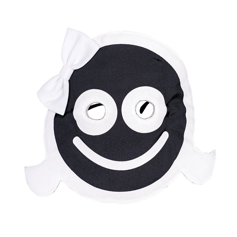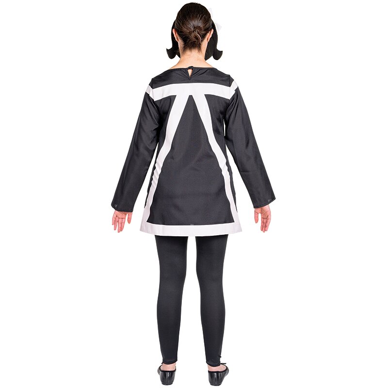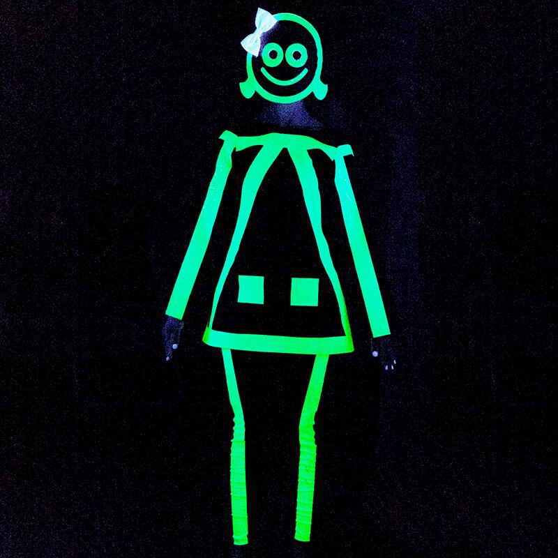 Schwarzes Kostüm-Set bestehend aus einer Tunika und einer Hose. Auf den Kleidungsstücken sind die Konturen eines Strichmännchens aufgemalt, die im Dunkeln leuchten. Die Maske wird auf eine Brille aufgezogen und ist mit einer Haarschleife verziert.