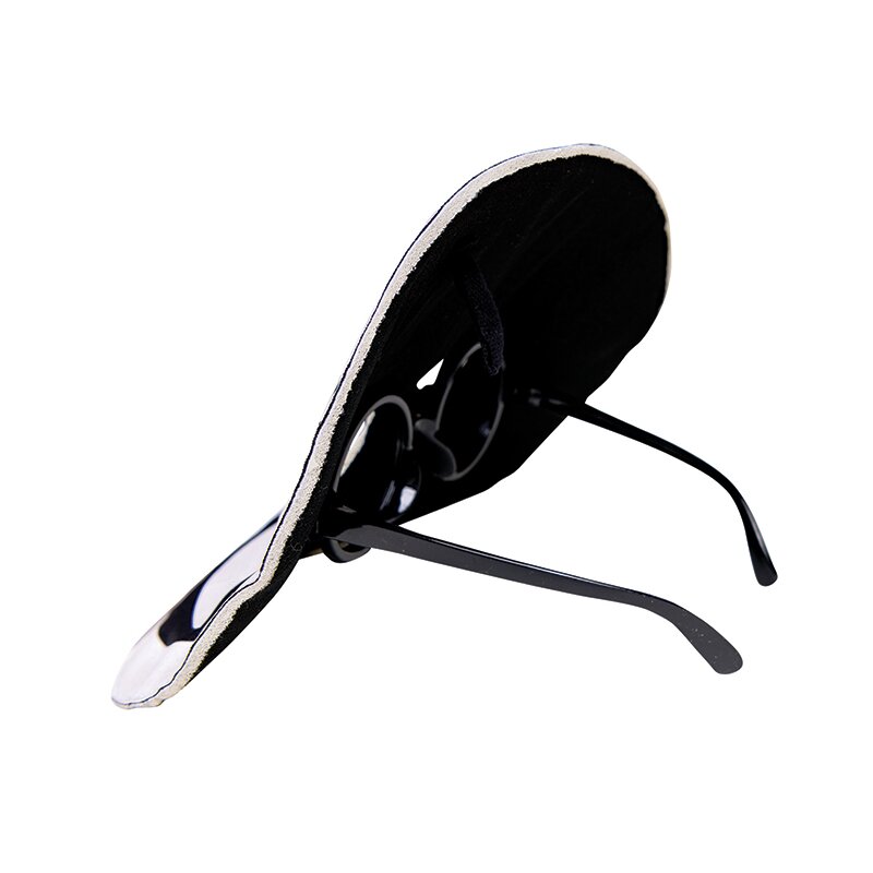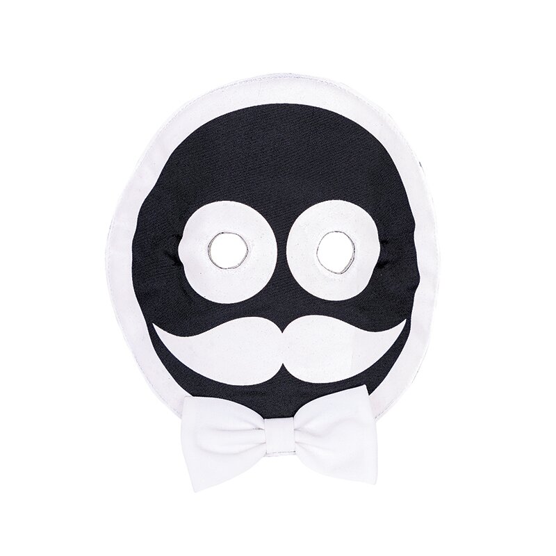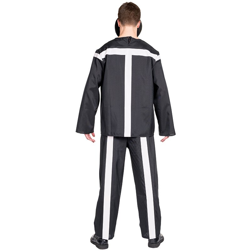 Schwarzes Kostüm-Set bestehend aus einem Oberteil und einer Hose. Auf den Kleidungsstücken sind die Konturen eines Strichmännchens aufgemalt, die im Dunkeln leuchten. Die Maske wird auf eine Brille aufgezogen und ist mit einer Fliege verziert.