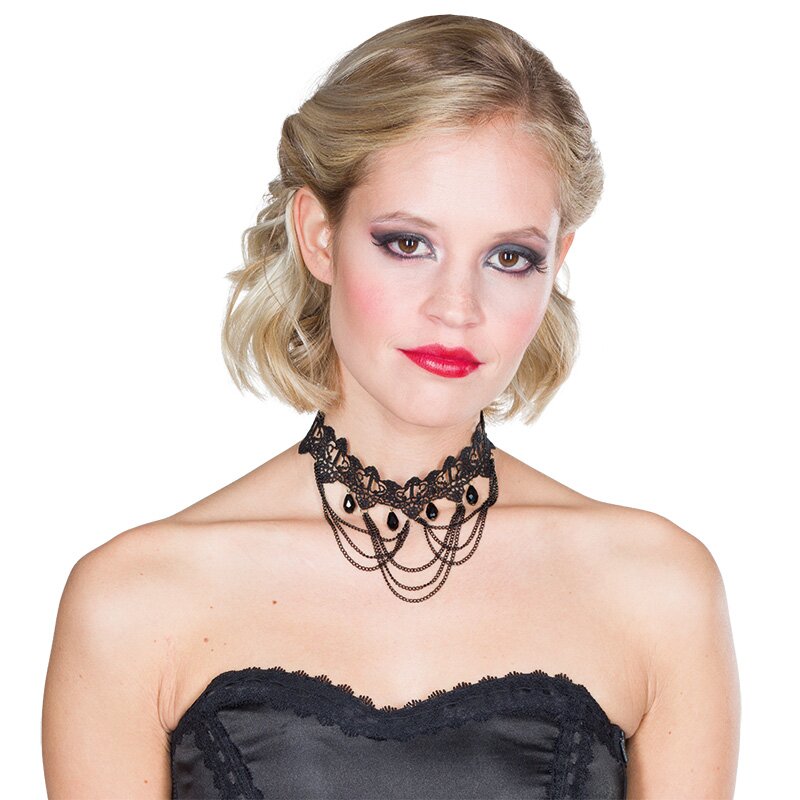 Halsband im Gothic-Stil aus schwarzer Spitzenborte, das mit schwarzen Schmucksteinen und bogenförmig befestigten Gliederketten dekoriert ist.