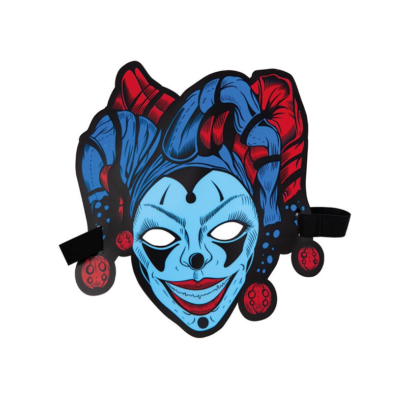 Biegsame Maske, auf die der Kopf eines Harlekins aufgedruckt ist. Die Maske ist mit kleinsten LEDs ausgestattet, die durch Klangeffekte aktiviert werden. Die Klangempflindlichkeit kann reguliert werden. Batterien sind nicht enthalten.