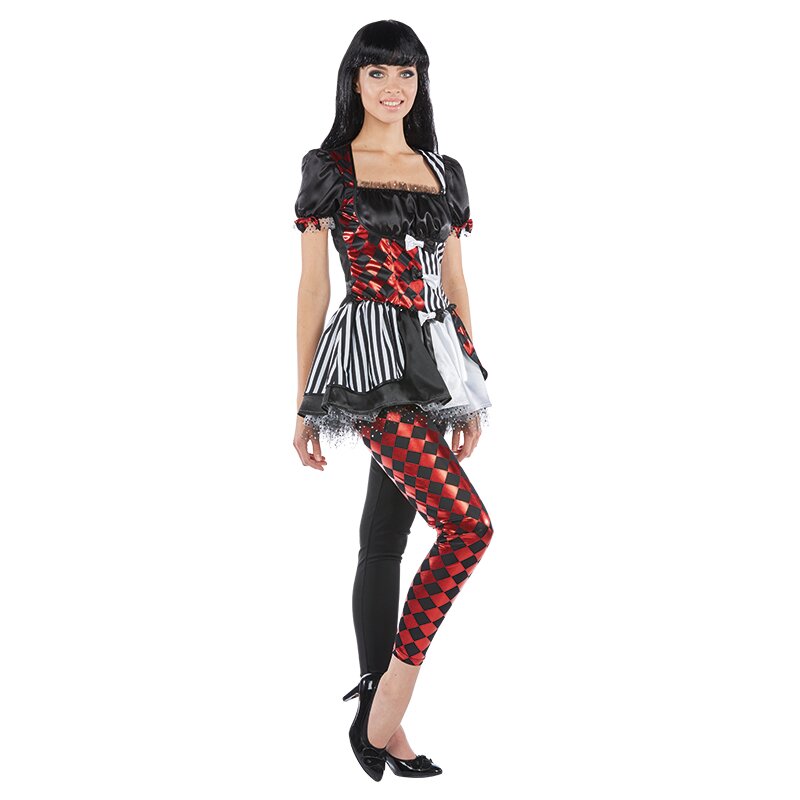 Zweiteiliges Harlekinkostüm für Damen. Das Minikleid ist aus einem Mix an schwarzen und weißen Stoffen sowie rot gemusterten Designs erstellt und vorne mit Schleifen verziert. An den Säumen ist gepunkteter Tüll angesetzt. Dazu gehört eine Leggings mit einem schwarzen Hosenbein und eines mit rot-schwarzem Rautenmuster.
