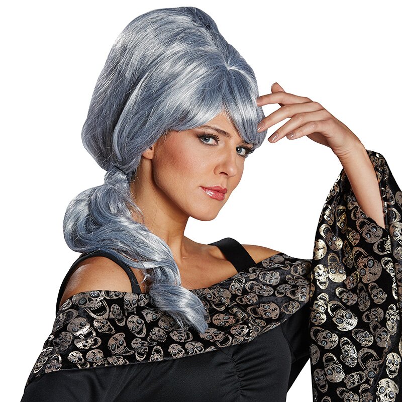 Silbergraue Perücke mit Pony und am Hinterkopf hochtoupiertem Haar. Das lange Haar ist im Nacken zu einem Pferdeschwanz geknotet.
