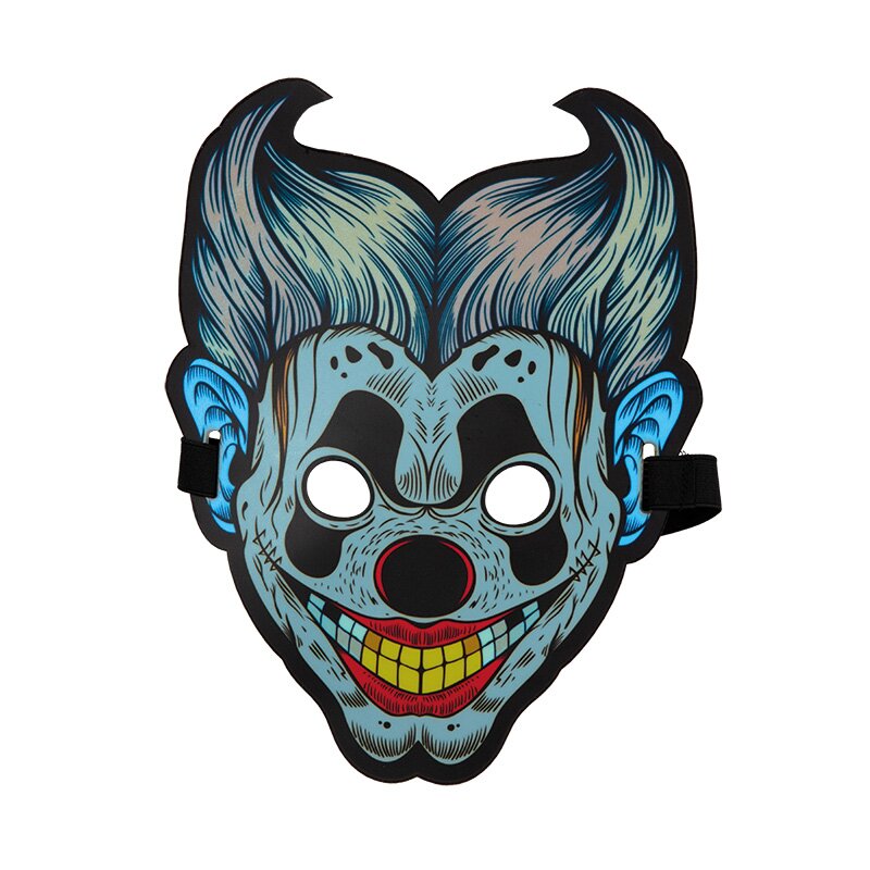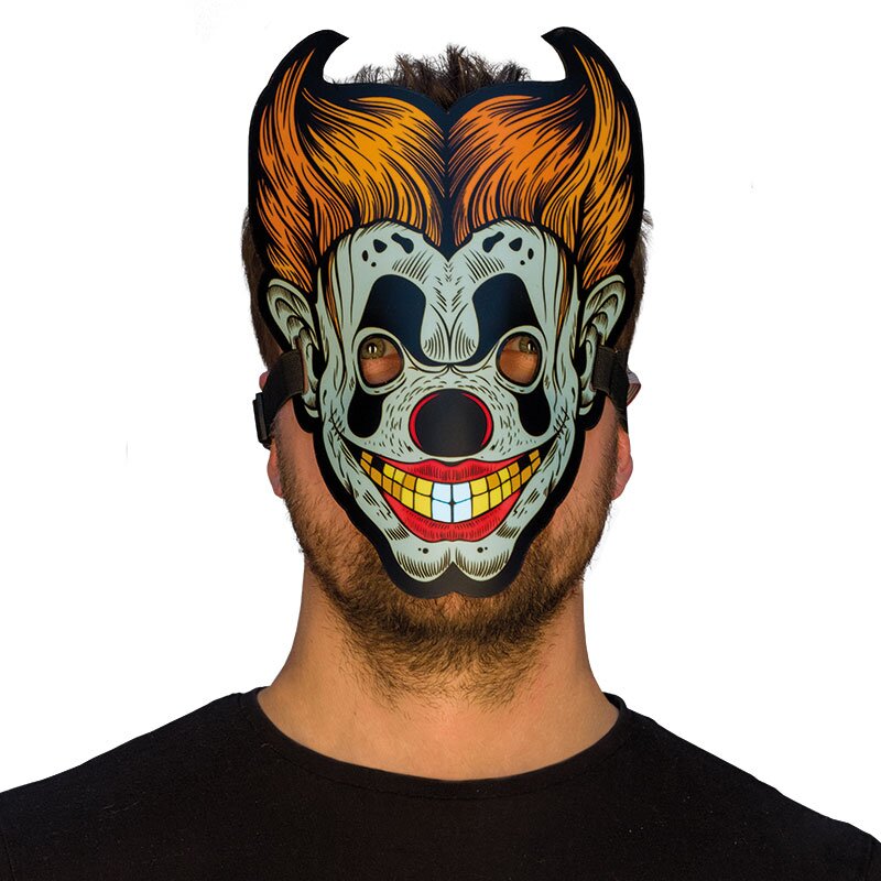 Biegsame Maske, auf die der Kopf eines Horror Clowns aufgedruckt ist. Die Maske ist mit kleinsten LEDs ausgestattet, die durch Klangeffekte aktiviert werden. Die Klangempflindlichkeit kann reguliert werden. Batterien sind nicht enthalten.