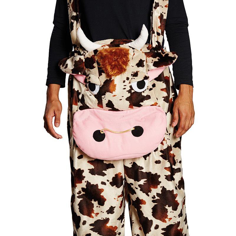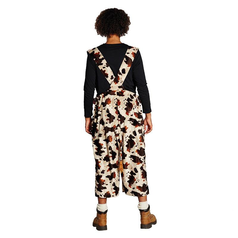 Beige Trägerhose mit Kuhfleckenmuster und Hosenbeinen in 3/4-Länge. Der Latz besteht aus eine Kuhkopf, an dem Hörner, ein braunes Haarbüschel, Ohren und Augen angebracht sind. Das hellrosane Maul ist gepolster und mit einem Nasenring durchzogen. Auf der Rückseite ist ein Kuhschwanz befestigt.