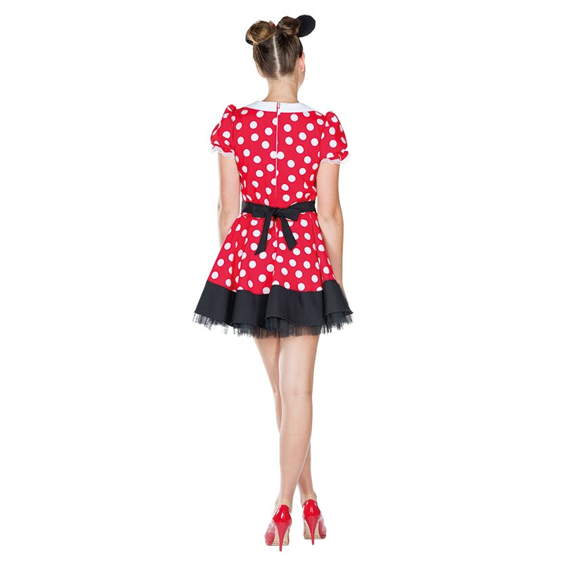 Rotes Minikleid mit großen weißen Punkten, kurzen Puffärmeln und weißem Kragen. Das Kleid ist mit einer Zierschleife am Ausschnitt und einem schwarzen Taillenband, das auf der Rückseite zu einer Schleife gebunden wird, verziert. Der Rock hat einen breiten, schwarzen Saum mit einer Tüllborte. Inklusive eines Haarreifs mit schwarzen Mäuseohren und einer rot-weiß gepunkteten Schleife.