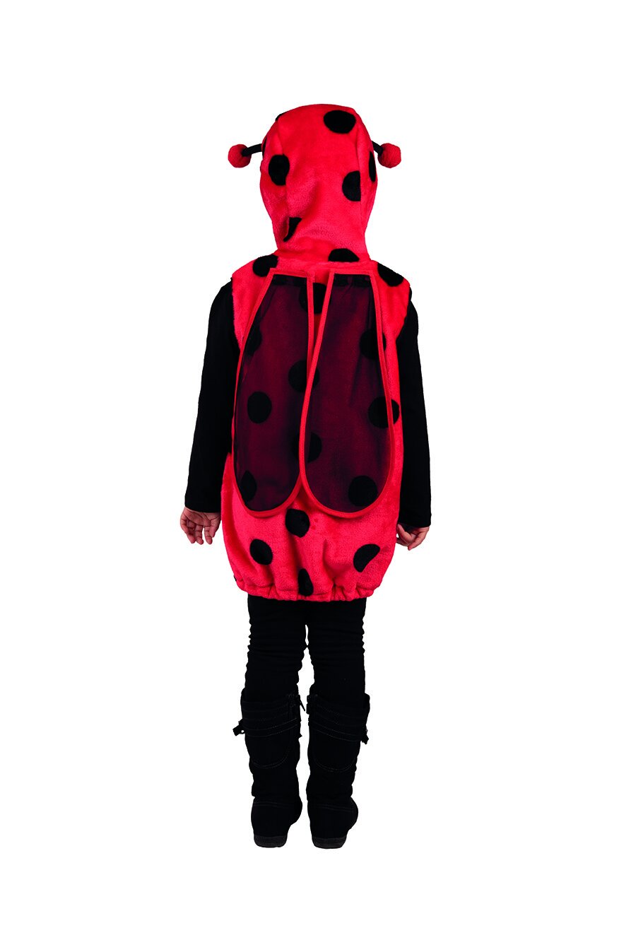 Niedliches Marienkäfer-Kostüm aus flauschigem Plüsch. Das ärmellose Kostüm wird vorne am Hals mit einem Klettpunkt geschlossen, der Saum ist mit einem Gummi versehen. An der Kapuze sind zwei Fühler aus Stoff angebracht, am Rücken sind leicht transparente Flügel mit Klettpunkten befestigt. Vorne links ist ein Marienkäfer-Sticker aufgenäht.