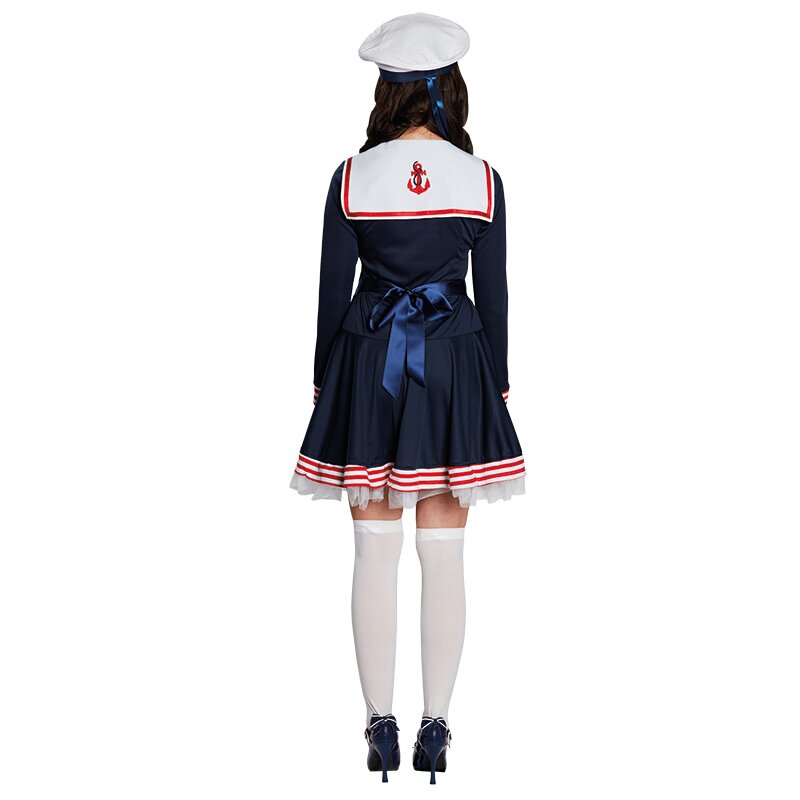 Dunkelblaues Matrosenkleid mit breitem, weiß-rot gestreifter Saum an Rock und Ärmeln, sowie einer Tüllrüsche am Rock. Der angenähte weiße Matrosenkragen ist mit roter Borte und Ankern verziert und vorne zu einer Schleife gebunden. Die Taille ist mit rot-weißer Litze und goldenen Zierknöpfen betont. Auf der Rückseite befindet sich eine große Schleife aus blauem Glanzstoff.