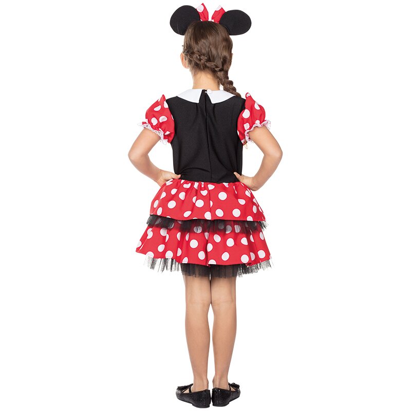 Rotes Kleid mit großen weißen Punkten und kurzen Puffärmeln. Das Kleid hat einen weißen Rundkragen und ein weißes Taillenband mit einer Zierschleife. Der zweireihige Rock ist jeweils mit schwarzem Tüll unterfüttert. Inklusive eines Haarreifs mit runden schwarzen Mäuseohren und einer großen Zierschleife.