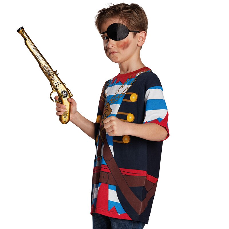 Goldfarbene Pistolenattrappe, die mit Ornamenten und einem Totenkopfmotiv verziert ist.