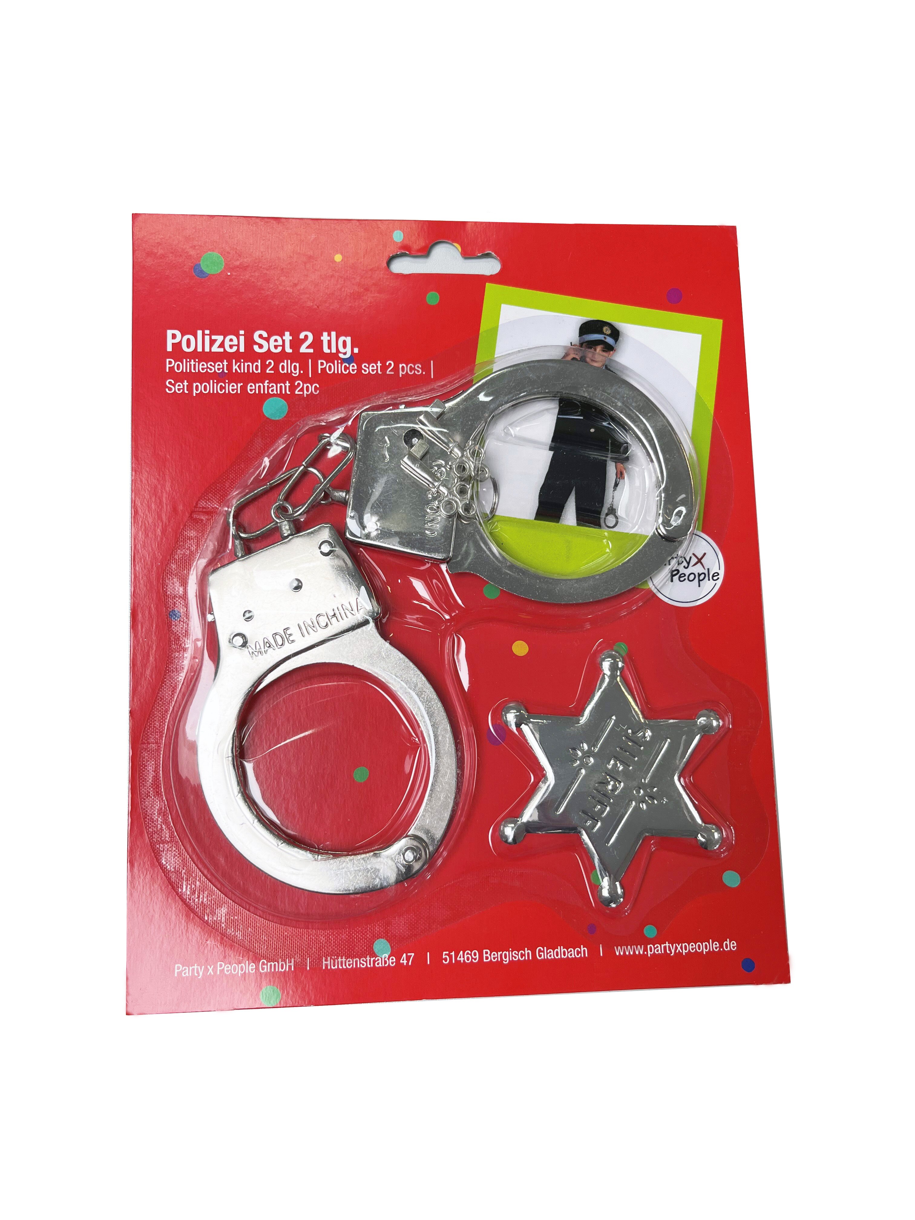 2teiliges Polizei-Set mit metallfarbenen Handschellen und einem Sheriffstern.