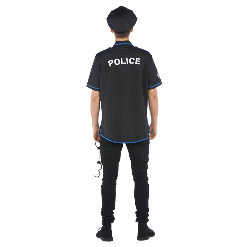 Dunkelblaues Polizeihemd mit hellblauer Borte an den Säumen, Taschen, Schulterklappen und dem Kragen. Die Aufschrift "Police" ist auf der Brust und auf dem Rücken angebracht. Das Hemd wird vorne geknöpft.