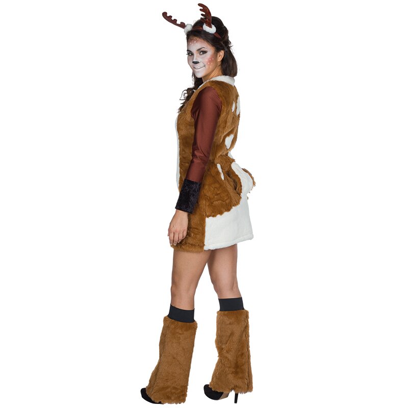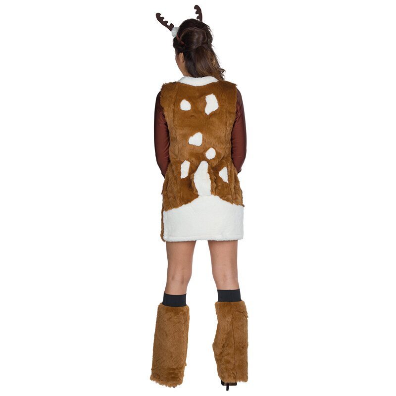 Minikleid aus braunem Plüsch mit dunkelbraunen Enden an den langen Ärmeln und einer großen weißen Blesse auf der Vorderseite, die mit einem Schmetterling dekoriert ist. Die Rückseite ist mit weißen Flecken und einem angenähten Schwanz verziert. Inklusive eines Haarreifs mit glitzernden Geweihen und Beinstulpen aus braunem Plüsch.