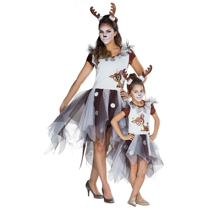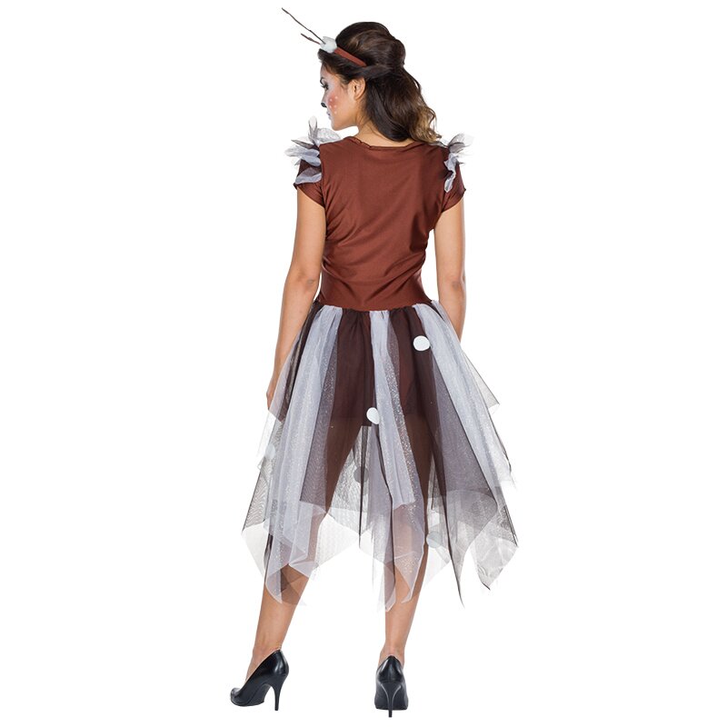 Kurzärmliges Kleid mit einem weißen Oberteil, auf dem ein glitzerndes Rehkitz aufgedruckt ist. Der Rock ist mit braun-weiß gepunkteten und weiß glitzernden Tüllstücken bedeckt, die in der Länge von vorne nach hinten abfallen. Der Kragen und die Ärmel sind ebenfalls mit Tüllstücken verziert. Inklusive eines Haarreifs mit glitzernden Geweihen, die mit weißem Plüsch verziert sind.