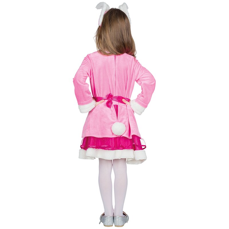 Kleid mit angenähter Jacke aus rosanem Pannesamt. Der pinke Rock wird von einem Glitzertüllrock in der gleichen Farbe umspielt. Das Oberteil, die Ärmelaufschläge und der Rocksaum sind aus weißem Plüsch. Das Kleid ist auf der Rückseite mit einer Schleife und einem kleinen Schwänzchen verziert. Inklusive eines Haarreifs mit Hasenohren aus Plüsch.