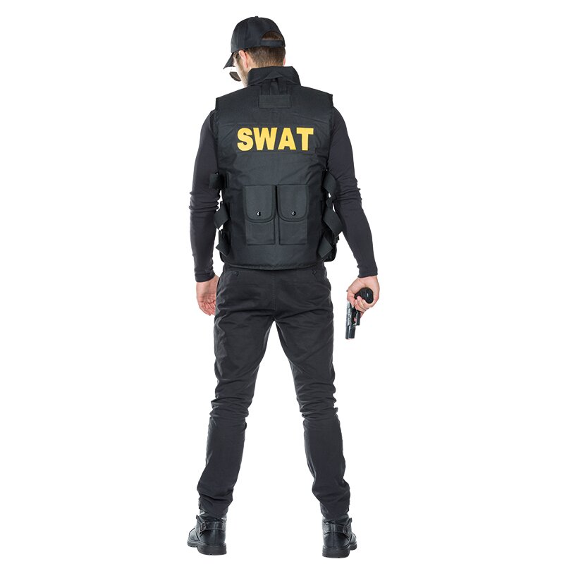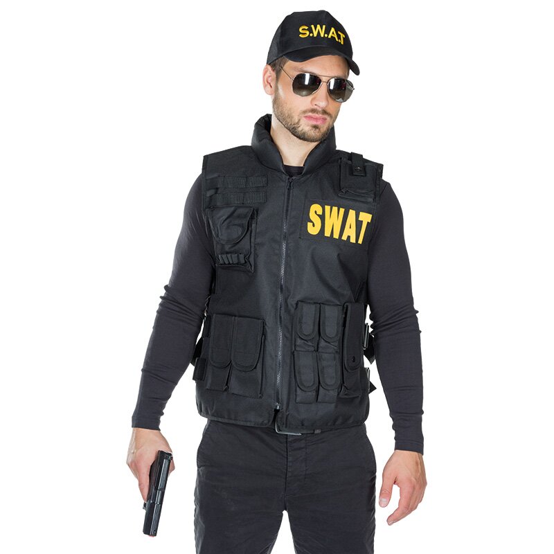 Wattierte schwarze Weste aus strapzierfähigem Nylonstoff mit diversen Taschen und einem langen Reißverschluss auf der Vorderseite. Auf der Brust und auf dem Rücken ist der Schriftzug SWAT in großen gelben Buchstaben aufgedruckt.