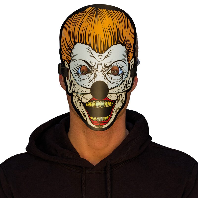 Biegsame Maske, auf die ein gruseliger Kopf aufgedruckt ist. Die Maske ist mit kleinsten LEDs ausgestattet, die durch Klangeffekte aktiviert werden. Die Klangempflindlichkeit kann reguliert werden. Batterien sind nicht enthalten.