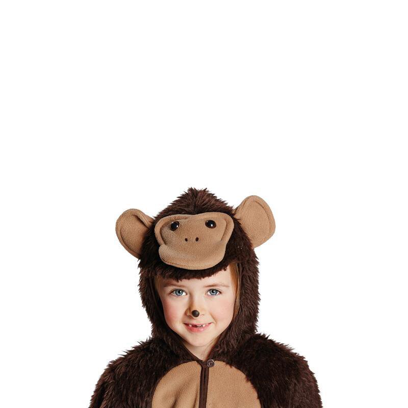 Zweiteiliges Affenkostüm aus braunem Plüsch. An der Kapuze des Oberteils ist ein Affengesicht angebracht. Die Vorderseite ist mit einem beigen Brusteinsatz und einer aufgenähten Banane verziert.