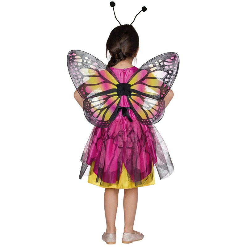 Ärmelloses Kleid aus gelbem Glanzstoff. Das Oberteil ist mit schwarzer Borte und glitzernder rosanen Tüllrüsche dekoriert. An der Taille sind pinkfarbene Stoffstücke angebracht, die von glitzernden Tüllstücken mit Schmetterlingsflügelmotiv bedeckt werden.