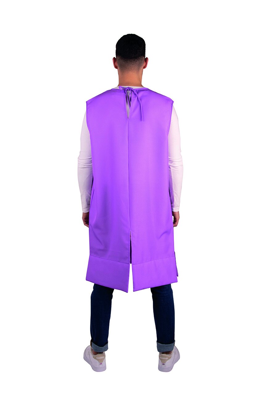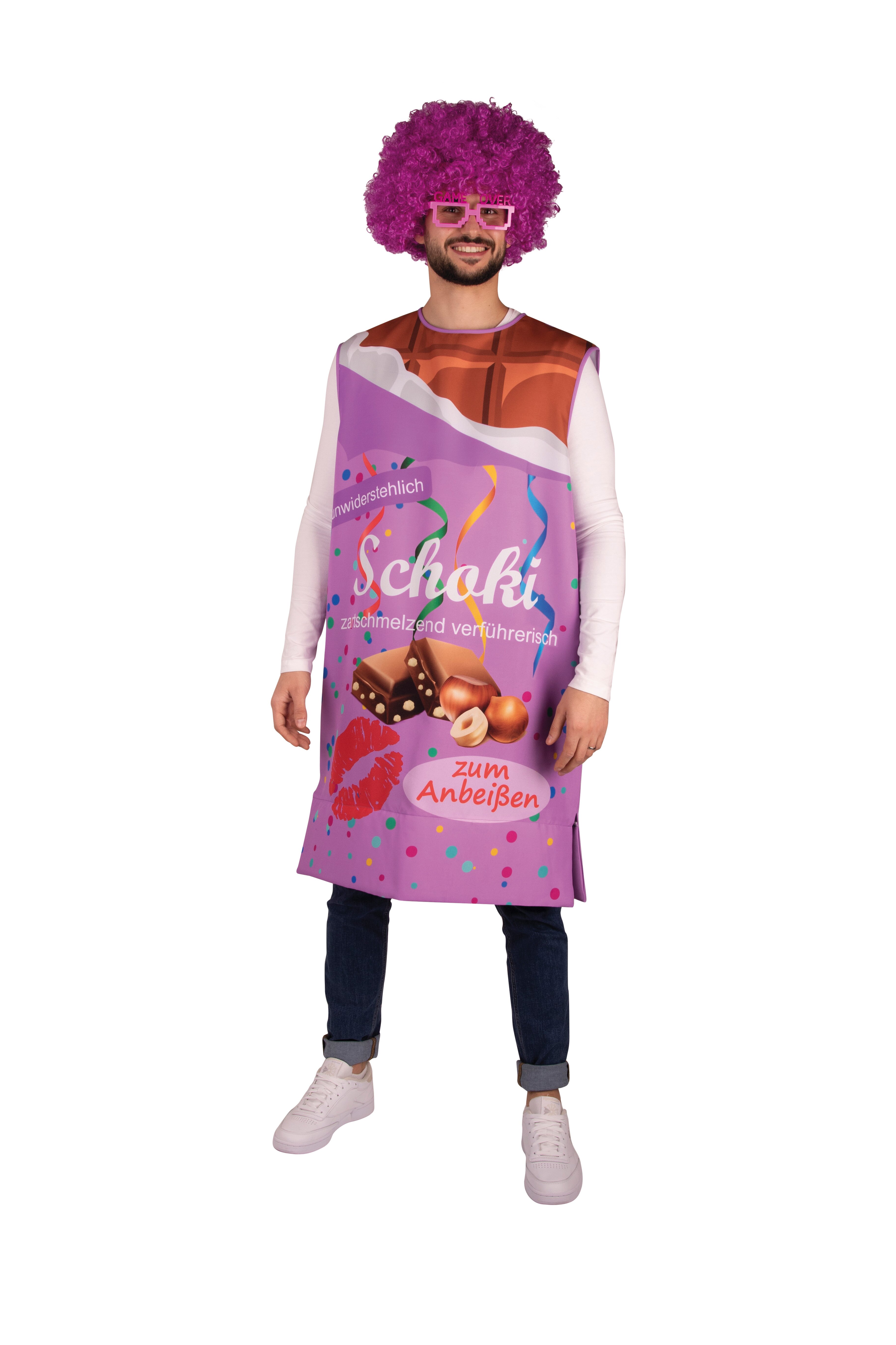 Lila Robe mit Schoki-Druck vorne für Damen und Herren. Das Kostüm wird am Halsausschnitt hinten mit einer Schleife gebunden und hat einen wattierten Abschluss unten, damit die angedeutete Tafel-Form beim Tragen erhalten bleibt. Die Rückseite ist uni lila.