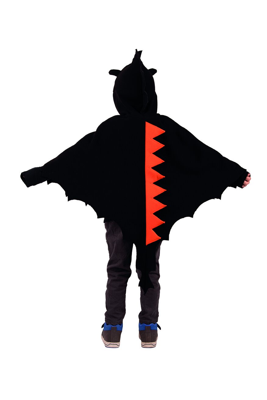 Drachencape für Kinder aus kuscheligem schwarzem Fleece. Das Cape wird vorne mit einem Klettpunkt verschlossen und hat an den Seiten zwei Armausgänge. Das Cape hat einen rundum gezackten Abschluss, drei Abnäher auf jeder Seite vorne und eine Kapuze mit aufgenähten Augen und Nasenlöchern aus Filz sowie kleinen Öhrchen. Rückseitig ist ein gezackter Drachenschwanz aus orangem Filz aufgebracht.