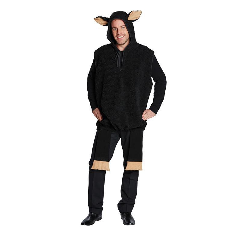 Ärmelloses Kapuzenoberteil aus weichem, schwarzen Fleece. Am Kopf sind Schafsohren, auf der Rückseite ein Schwanz und am vorderen Saum Schafsbeine angenäht.