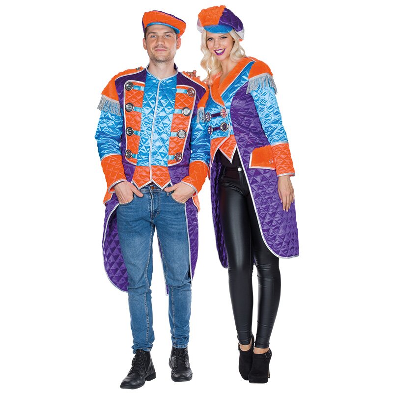 Mantel in klassischer Frackform aus gestepptem Stoff in den Farben Lila, Blau und Orange. Große silberne Dekoknöpfe, Säume sowie Fransenborte verzieren den Mantel. Die Schultern, die aufgesetzten Taschenklappen, der Kragen und der Riegel auf der Rückseite sind mit orangenem Plüsch besetzt.