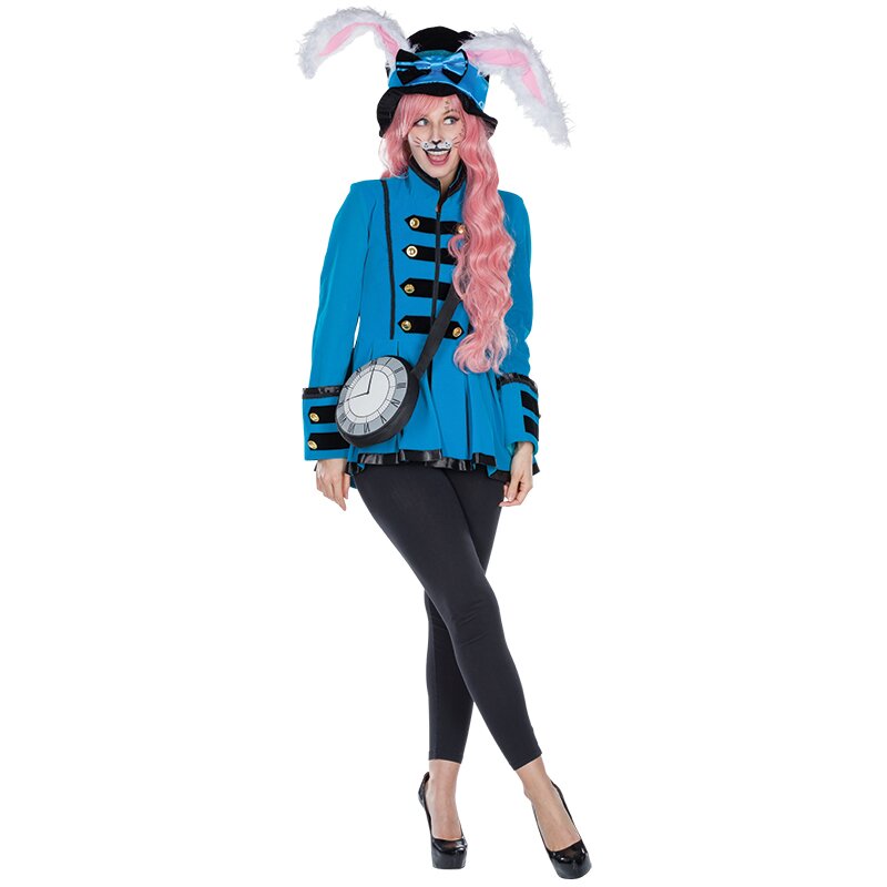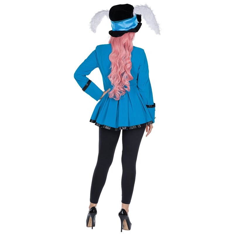 Blaue Jacke mit plissiertem Schößchen, Stehkragen und breiten Ärmelmanschetten. Die Jacke ist mit schwarzen Riegeln und goldfarbenen Knöpfen verziert.