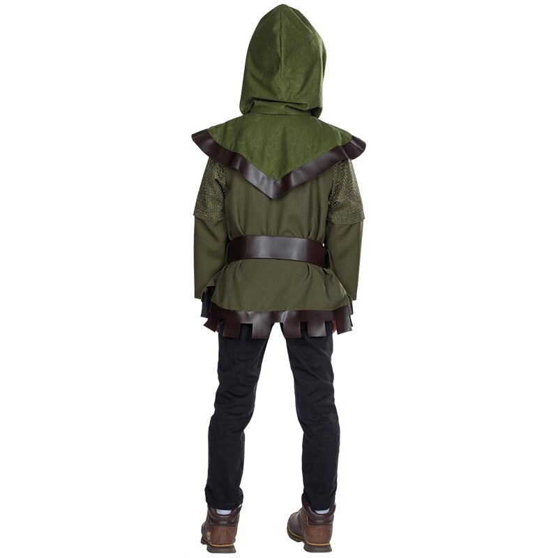 Mittelalterlisches dunkelgrünes Kapuzenoberteil, das an den Säumen in Wildlederoptik gehalten ist. Die Oberarme sind mit einem Tüllstoff in Kettenhemdoptik überzogen. Entlang des Kragens sind goldene Ziernieten eingearbeitet. Inklusive eines Gürtels in brauner Lederoptik.