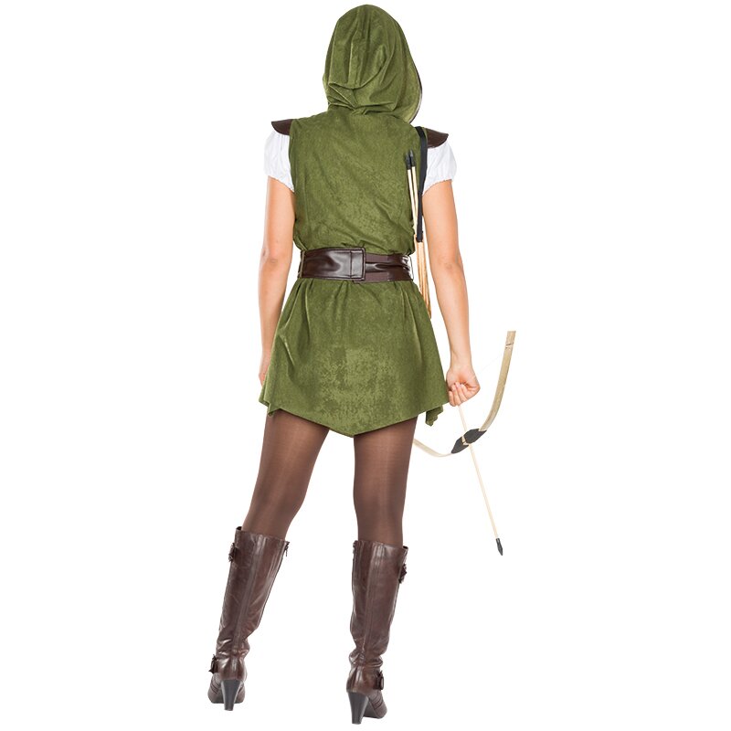 Mittelalterlisches dunkelgrünes Kapuzenkleid mit Flügelärmelchen und Besatz in Wildlederoptik. Am Ausschnitt ist eine Schnürung eingearbeitet. Inklusive eines breiten Gürtels in brauner Lederoptik mit Zierschnalle.