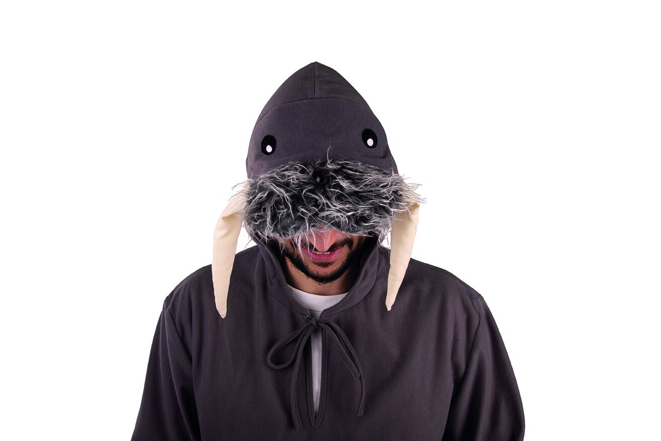 Braunes, kuscheliges Kapuzenoberteil für Damen und Herren mit Schnürung am Hals vorn. An die Ärmelenden sind Flossen aus Stoff genäht, die über die Hände fallen. Die Kapuze ist weiß gefüttert und hat ein Walrossgesicht mit seitlichen Stoffzähnen, Augen, Nase und lustigem Bart.