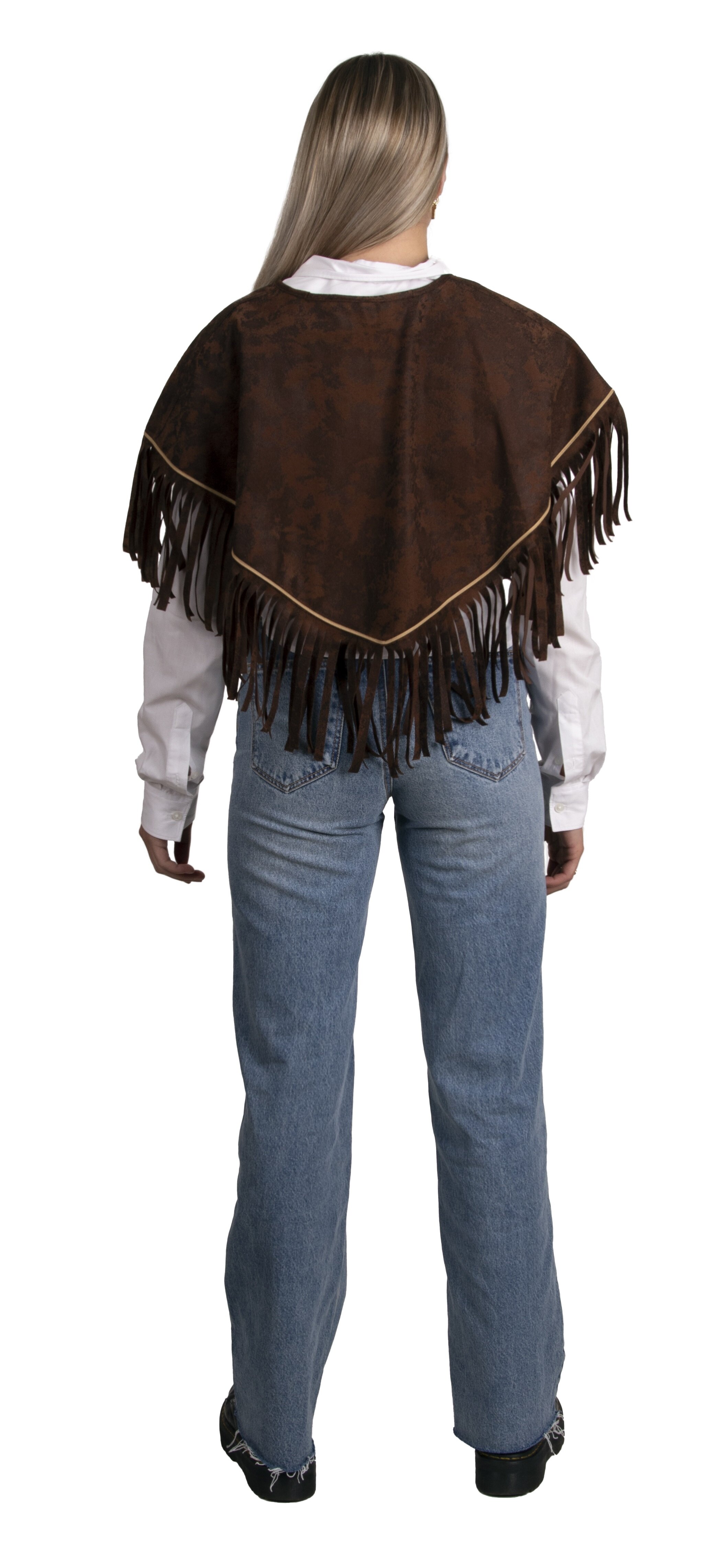 Western-Poncho in Lederoptik, mit Fransen, Ziernähten, verziert mit Federn und hellen Patches.