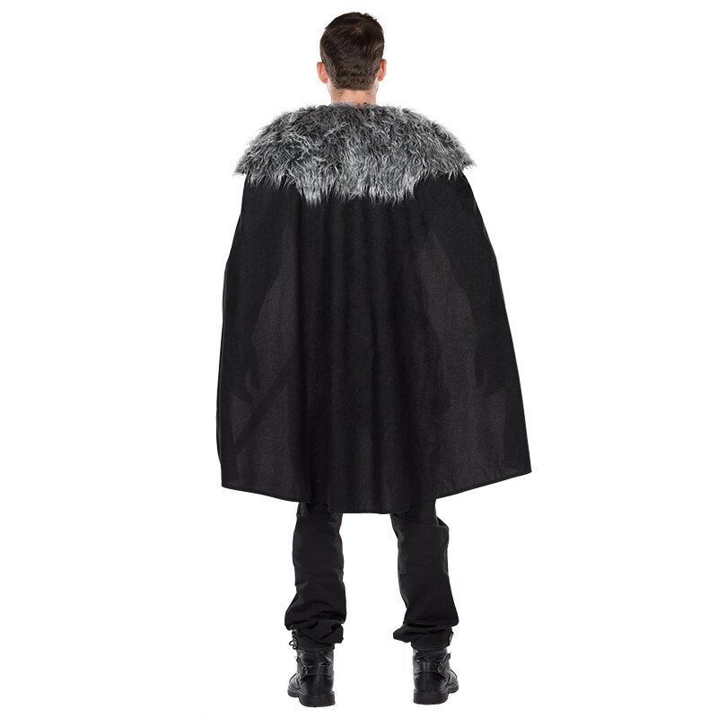 Schwarzes Cape mit einem breiten grauen Fellkragen und einem Verschluss aus zwei silbernen Zierknöpfen, die mit einer Kette verbunden sind.