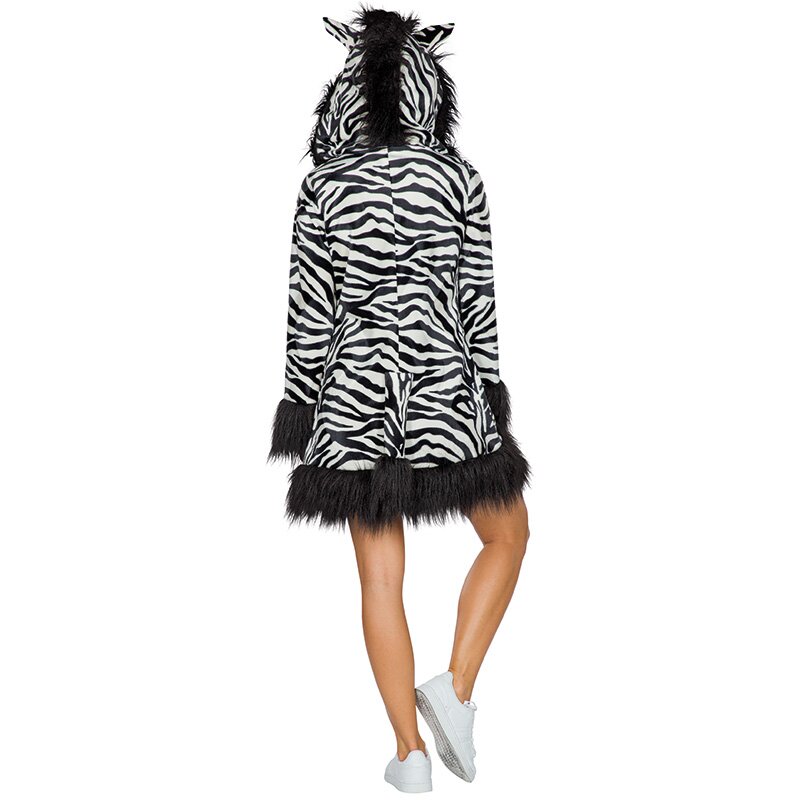 Kapuzenkleid in schwarz-weißem Zebramuster, das an den Säumen von Ärmeln und Rock mit einer breiten Fellborte besetzt ist. An der Kapuze sind Ohren und eine schwarze Mähne befestigt. Die Bändel an der Kapuze sind am Ende mit Fellbommeln verziert.