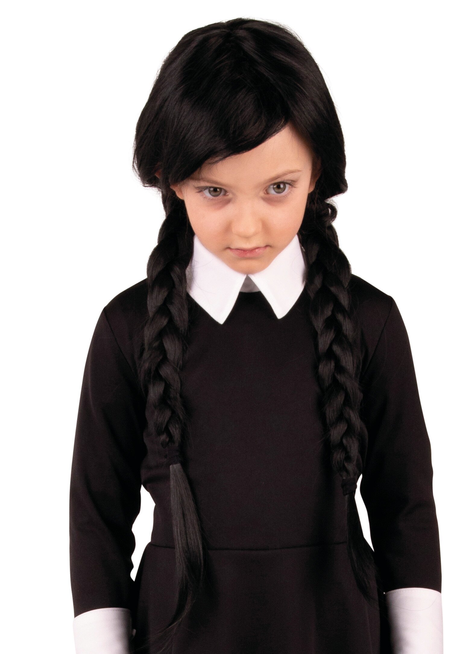 Schwarze lange Zopfperücke. Dank Gummizug im Haarnetz tragbar für Erwachsene und Kinder.