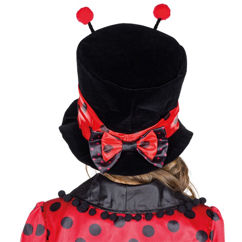 Schwarzer Zylinder mit einem breiten rot-schwarz gepunkteten Hutband. Am Hut sind Fühler befestigt. Huthöhe ist ca. 17 cm.